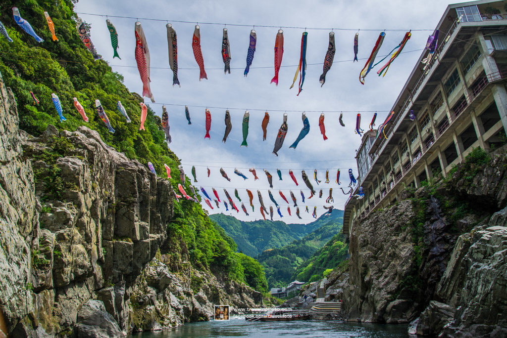 走到祖谷的山區,都可以看到溪流經這個V字形溪谷中。夏天是一片嫩綠,而到了秋天,從谷底到山頂滿山都是紅葉。山谷中有塊突出的岩石,是修建祖谷街道工程時留下的,上面有一個小小的平面。 據說過去當地的孩子們會站在上面試膽量,這個小便小僧就是根據這件事而修建的。
