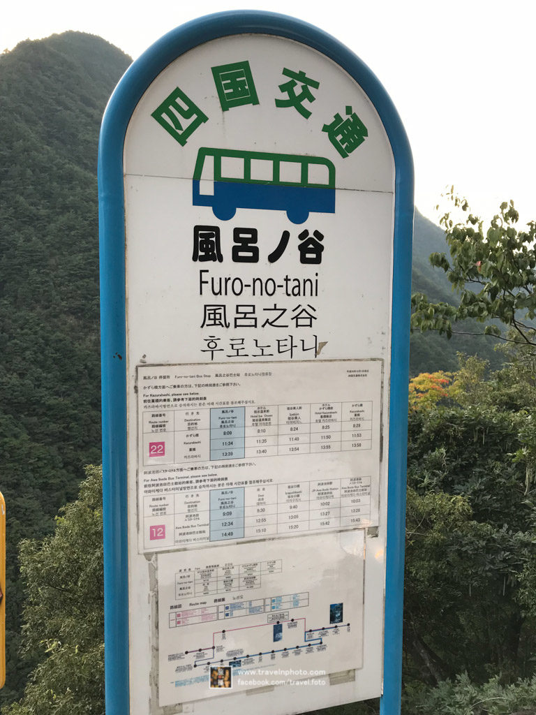 從JR阿波池田駅搭乘四国交通巴士(かずら橋行),在「風呂ノ谷」站下車。有兩條「風呂之谷」22及12 線可以到,不過班次很疏