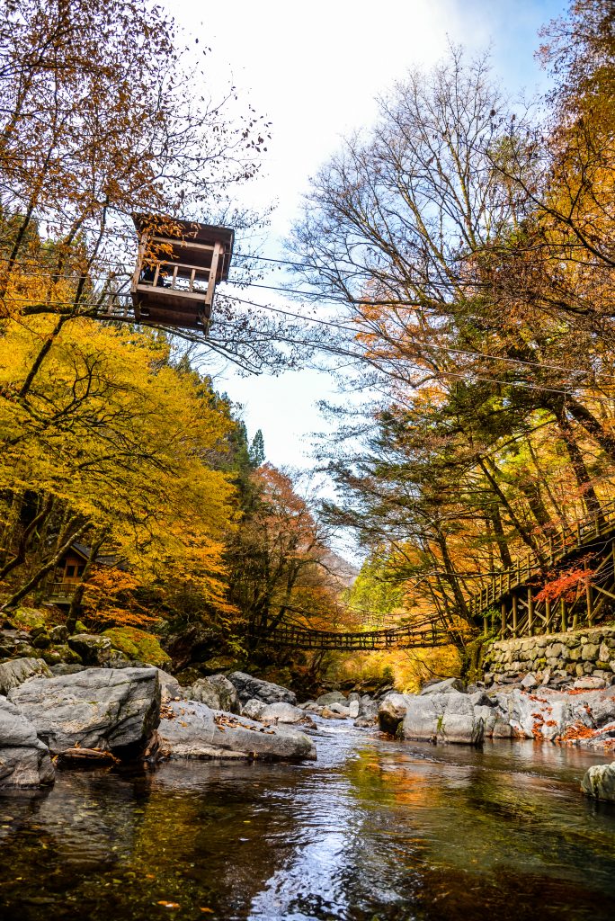 位於秘境祖谷的藤蔓橋是日本三大奇橋之一,『蔓橋』指的就是以山谷間野生的攀緣莖植物架成的吊橋。祖谷地區那邊有條祖谷蔓橋,旅行團遊客比較多,而這次去的是奧祖谷二重蔓橋。這座橋雖然是用堅固的藤蔓來建造成, 但另一個用意則是在追兵前來時可以隨時砍斷橋來切斷追兵的去路。橋身長45米、闊2米、距離水面14米,每3年會重新架設一次。