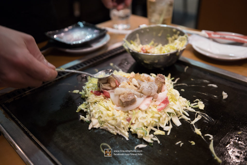 大阪燒日文稱為Okonomiyaki,材料非常豐富。顧客依個人喜好加入豬肉、牛肉、魷魚、蝦、蟹、雞蛋等配料,配上滿滿的菜絲及木魚片等等,最後加上沙律醬和大阪燒醬。