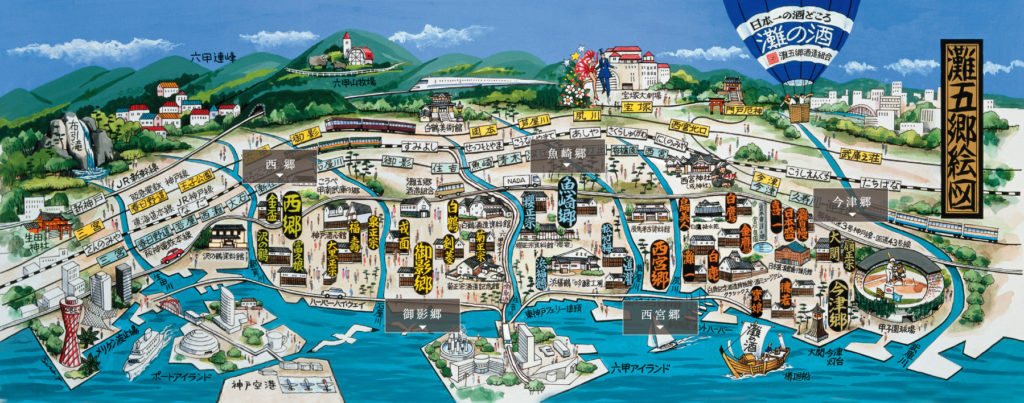 由大阪乘坐火車大約30分鐘便可抵達的兵庫縣神戶市的灘區,西鄉、御影鄉、魚崎鄉、西宮鄉、今津鄉被稱為「灘五鄉」,是日本酒的故鄉。坐阪急電鐵的話,釀酒區橫跨久壽川駅至新在家駅,如今周圍都可找到釀酒廠,也是全日本釀酒廠最密集的地方。