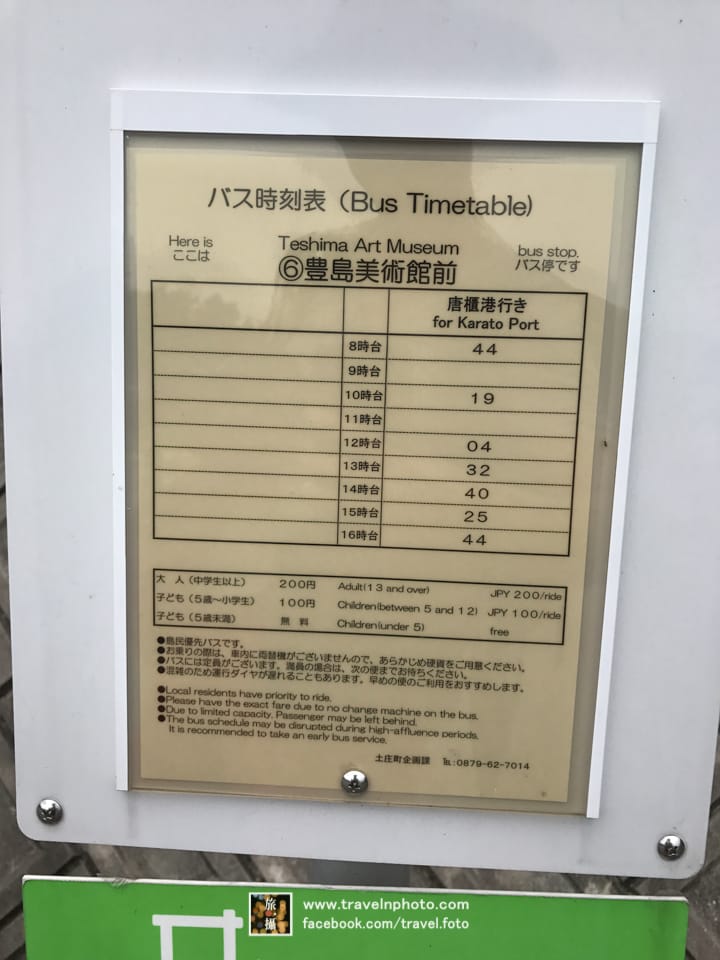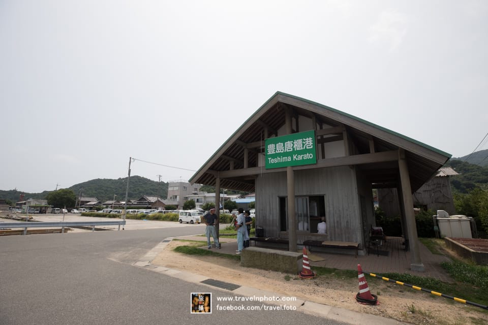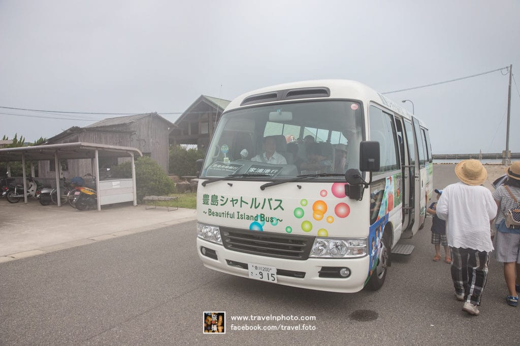 早上由高松港乘坐九時五十五分的船前往豐島,船程35分鐘。當達豐島港口渺無人煙,行近幾分鐘對面有一間租單車的檔口,不過老闆示意再沒有單車出租,剛好在背向小店(即是下船往左手面)左手邊有一架小巴直往位於半山上的美術館,也是島上唯一公共交通,在炎熱天氣下200円五分鐘的車費比得份外豪爽。不過車班次不多,少於一小時一班,安排行程時要留意。如果閣下打算用完整一天去玩豐島的話,是沒有大問題的。