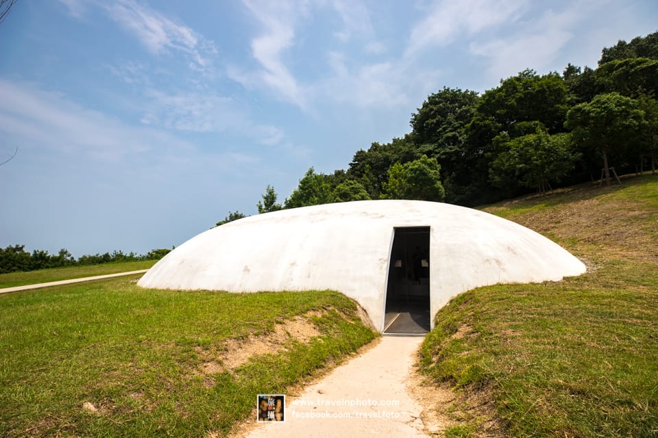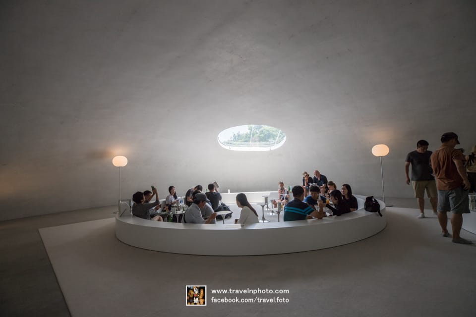 沿著兩旁滿佈植物的小路,進入藝術品的入囗處,由於入面人數已過上限,大家按著指示在門口排隊及講解規則,例如入館內先脫鞋子、把電話及攝影器材收在提供的透明袋子內、輕聲說話。過了二十多分鐘,終於到我入館內參觀,看見第一眼已令人覺嘆為觀止,它的設計外形是以水滴形態的混凝土構造,打造出內部沒有任何一根柱子的獨特建築。透過兩個開口進入的風與光,展現出自然與建築互呼應的有機空間。自然、建築、藝術化為一體。除外更在地上佈滿無數小孔,不定時會有水從內溢出,令不同大小的水珠以不同形態聚在一起。場內有些躺在地下休息、有些在繪畫著所見所聞、有些繞過兩個由陽光照在地上的光源走走、有些十分專注地看著地下小孔冒出的大水珠。各人有不同欣賞及感受的方法,這也是美術館可愛之處。