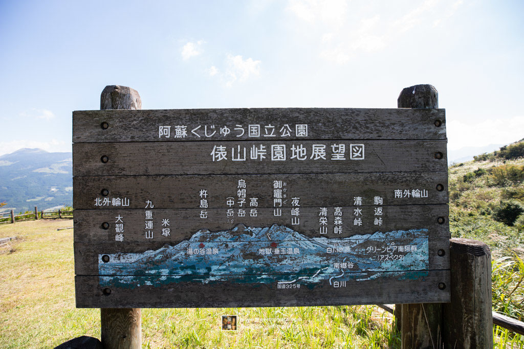 在這個範圍 有不少高高低低的山路,也有不少風光明媚的展望台。其中 各位於阿蘇山南部的俵山峠展望所。這裡除了可以看到阿蘇山脈之外﹐當然也看到南阿蘇的盆地風景,秋天的時候看到一大片芒草,後面更有巨大風力發電的風車,風車群所在地標高710m。這裏有也有一個涼亭,因此除了是欣賞風景的好地方之外,也是稍作休息的好地方。