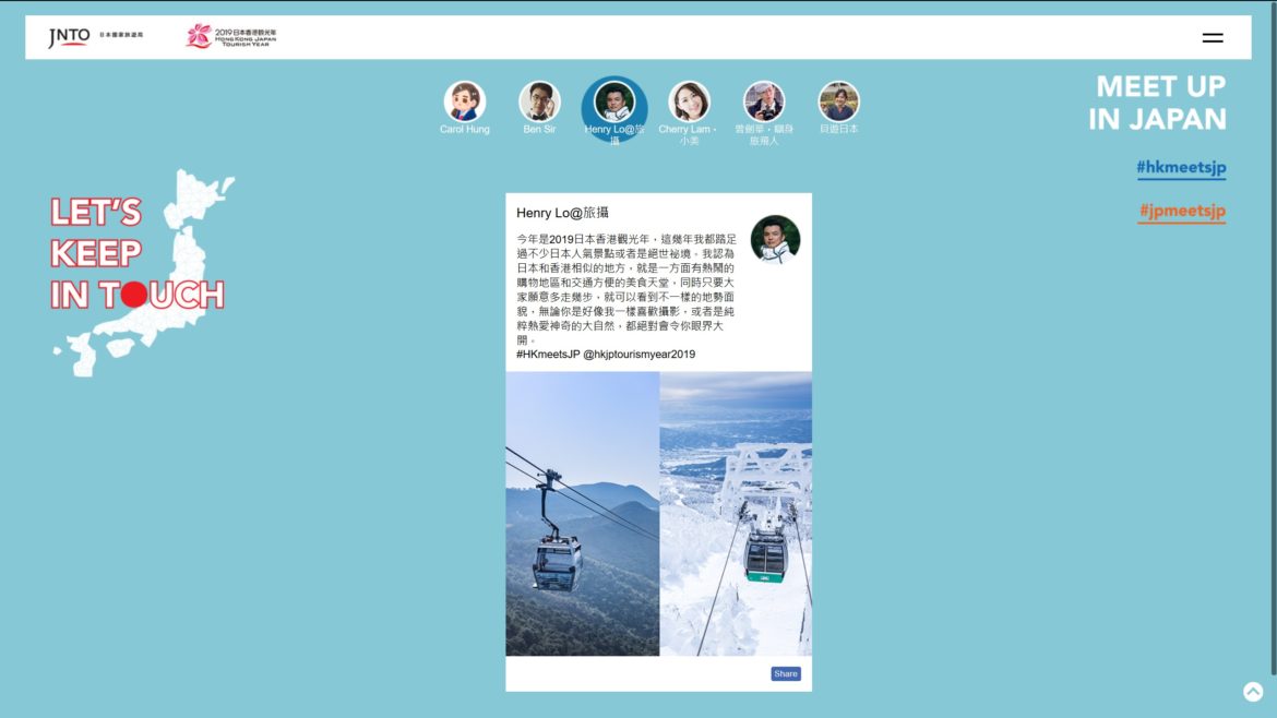 JNTO 2019「日本香港觀光年」合作https://welcome2japan.hk/hkjptourismyear2019/ Share FacebookTwitterPinterestEmail Previous Project Next Project